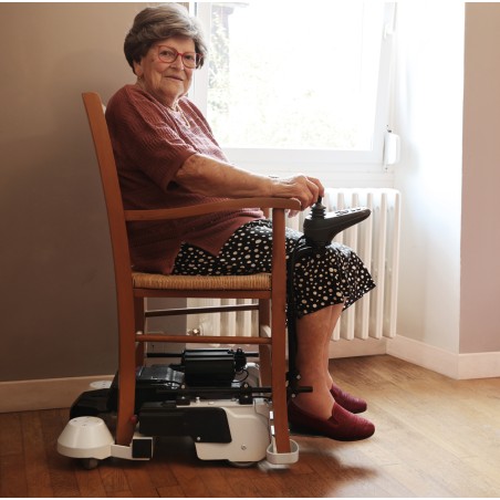 Support éléctrique réglable sur lequel on vient fixer sa chaise à 4 pieds. Il a un faible encombrement correspondant à celui de la chaise et tourne sur lui-même. Solution idéale pour se déplacer à son domicile ou sur son lieu de travail. C'est la dernière innovation chez Benoit Systemes ! Poids max. de l'utilisateur : 120 kg. Vitesse réglable : 1 à 4 km/h. Autonomie : 12 km.
