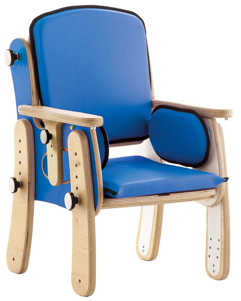Chaise en bois polyvalente pour tout milieu, scolaire, domicile, centre de rééducation. Conçue pour les enfants de 1 à 12 ans ayant des besoins posturaux légers à modérés. Réglable en hauteur (4 pieds) et en profondeur d'assise. Dossier réglable en angle et accoudoirs réglables en hauteur. Ceinture pelvienne en 2 points de série. Housses facilement lavables. Existe en 4 tailles pour 1 à 12 ans. Poids max. : de 30 à 50 kg. Plusieurs accessoires disponibles : plot d’abduction, palette réglable et coussin biseauté.