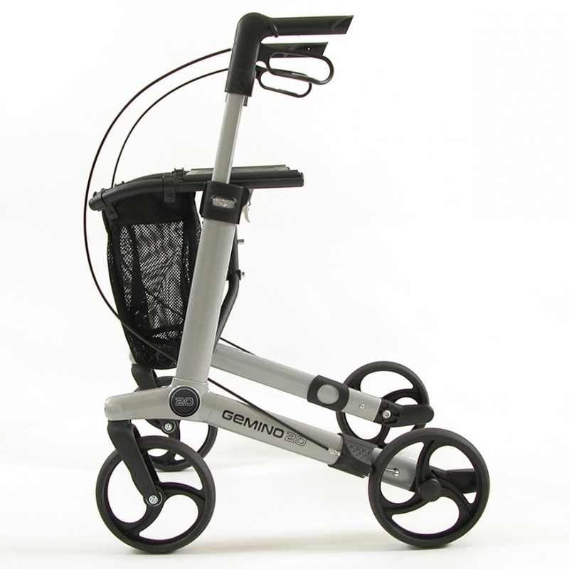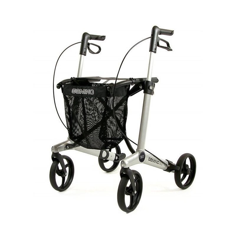 Gamme complète de rollators intérieur/extérieur : - standards : Gemino 20, 30 et 60 avec panier et siège de série, facilité d’utilisation - médicalisés : Walker du Gemino 30 et 60 avec appuis antébrachiaux de série ou Gemino 30 Parkinson pour personnes atteintes de Parkinson avec ralentisseur, fonction de freinage inversée et signal visuel laser au sol de série. Cadre en aluminium, système de pliage en un clic. Poids max. : de 125 kg à 150 kg (selon modèles). Garantie : 2 ans.