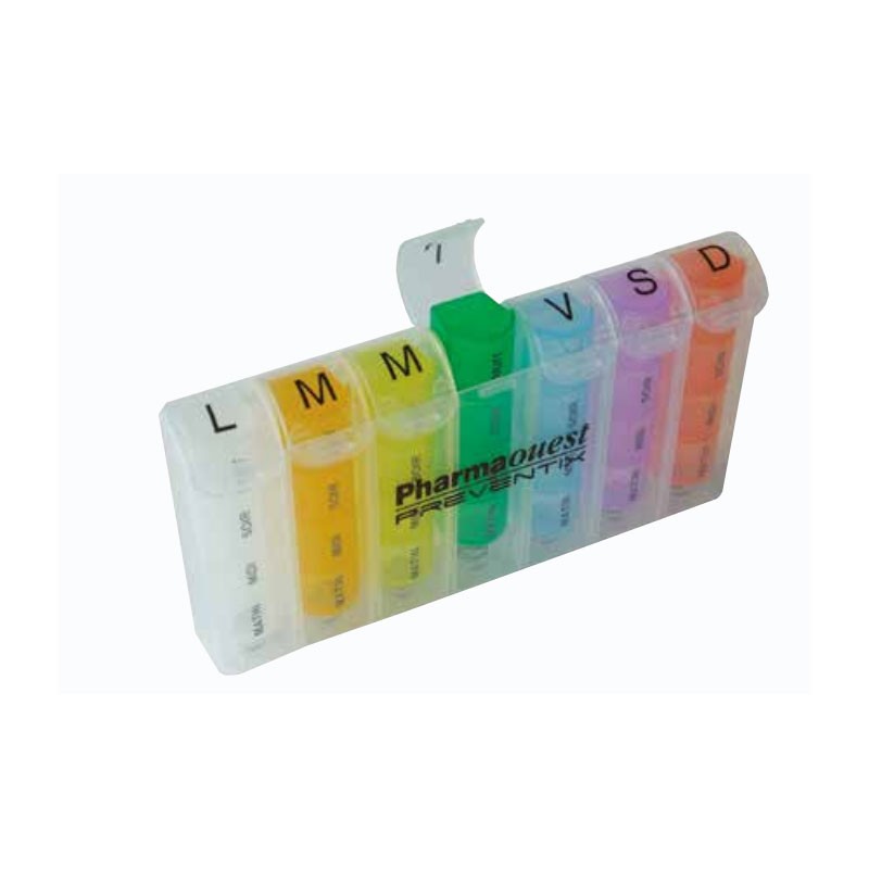 Pilulier semainier transparent afin d'avoir une meilleure vision globale. Les compartiments contiennent 4 cases avec indication (matin, midi, soir, nuit). Son système à ressort facilite l'accès aux différents compartiments. L'ouverture de chaque case se fait de manière indépendante afin d'éviter le risque d'erreur et de mauvais traitement.
