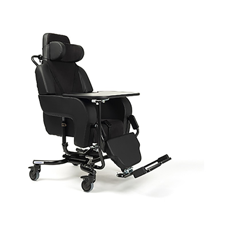 Livré avec appui-tête, harnais et repose-jambes réglables en inclinaison par vérin.