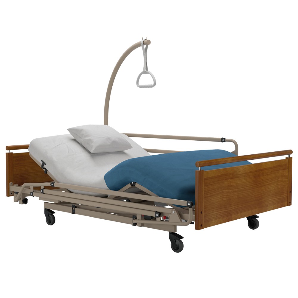 Sommier en 2 parties à lattes clipsables Hi-Tech (jusqu'à 160 cm de large). Lattes bois (jusqu'à 120 cm de large) sur demande. Hauteur variable de 33 à 81 cm et relève-buste électriques, relève-jambes manuel à crémaillères (2 fonctions). Pré-équipement pour relève-jambes électrique à plicature. Panneaux main courante Merisier. Dim. L 200 x l 120 x H 33-81 cm. Autres largeurs : 90, 110, 120, 140 ou 160 cm. Charge de fonctionnement : 400 kg. Poids max. : 270 kg. Options : barrières métalliques renforcées Fortissimo et potence. Normes : NF EN 60601-2-52. Garantie : 6 ans.