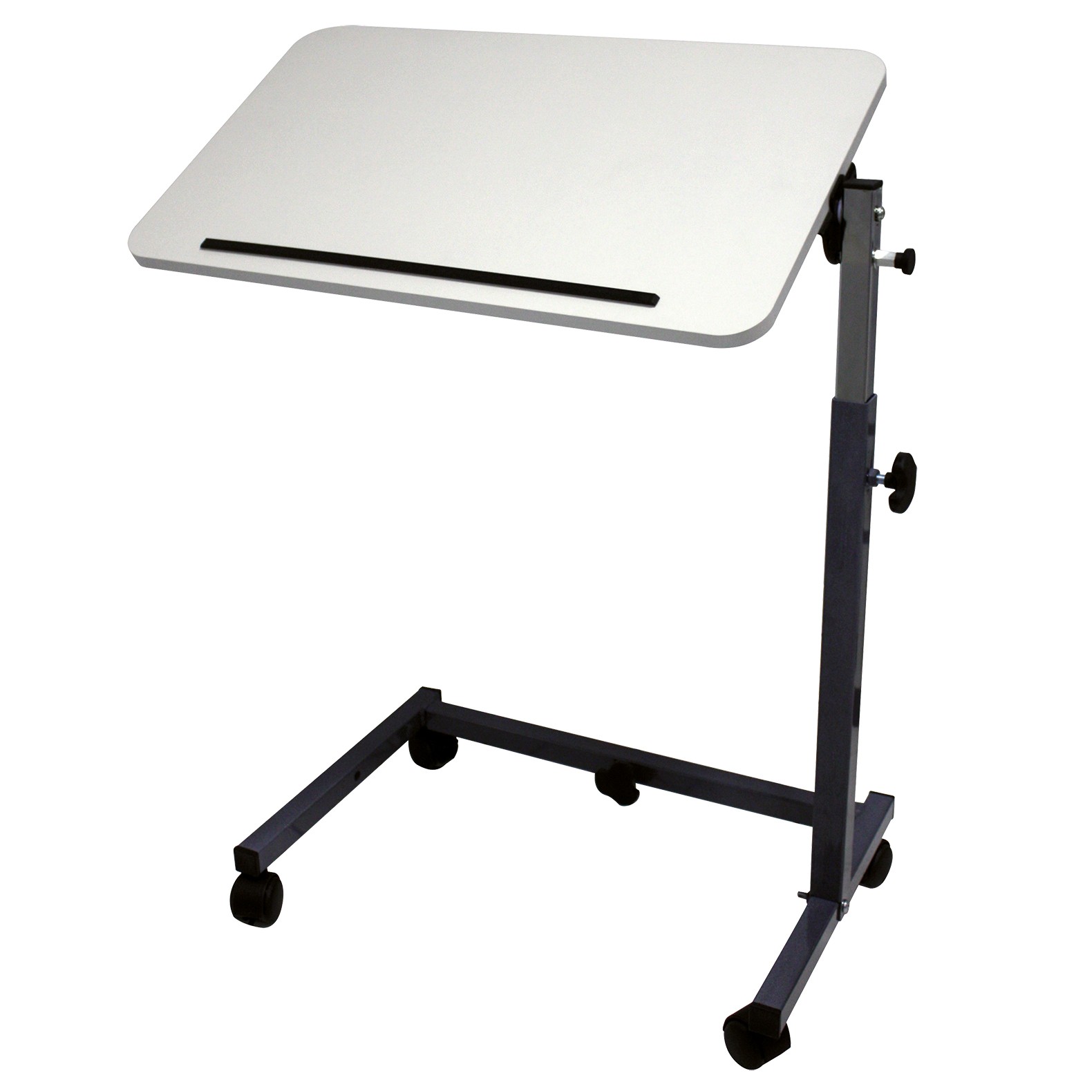Grand plateau simple inclinable et réglable en hauteur (40 x 70 cm). Piétement en U réglable en hauteur de 72 à 111 cm. Colonne positionnable à droite ou à gauche. Baguette de rétention. 2 roulettes à frein. 16 coloris de tubes, 3 coloris de plateau.