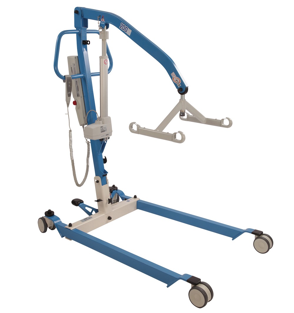 Lève-personne électrique avec moteur LINAK et télécommande 2 boutons. Pliant, pour un stockage vertical de l’appareil. Fléau 4 points pivotants à 360°. Roues arrière à freins, roues avant jumelées. Piétement à écartement variable. Possibilité de ramassage au sol (descend à 41 cm). Sangle non comprise. Poids max. : 200 kg. Coloris bleu et blanc. Garantie : 5 ans.
